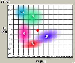 もちろん、別人の声であるから音声波形が異なるのは当たり前だろう。そこで、フォルマントを調べてみることにした。それが下のグラフである。赤丸部分が「あァ〜ン」の秘密を解くポジションである。「あァ〜ン」のフォルマントと日本語の母音がどういう位置にあるかを表示したものである。