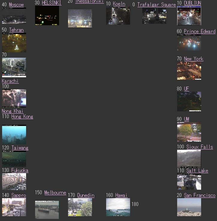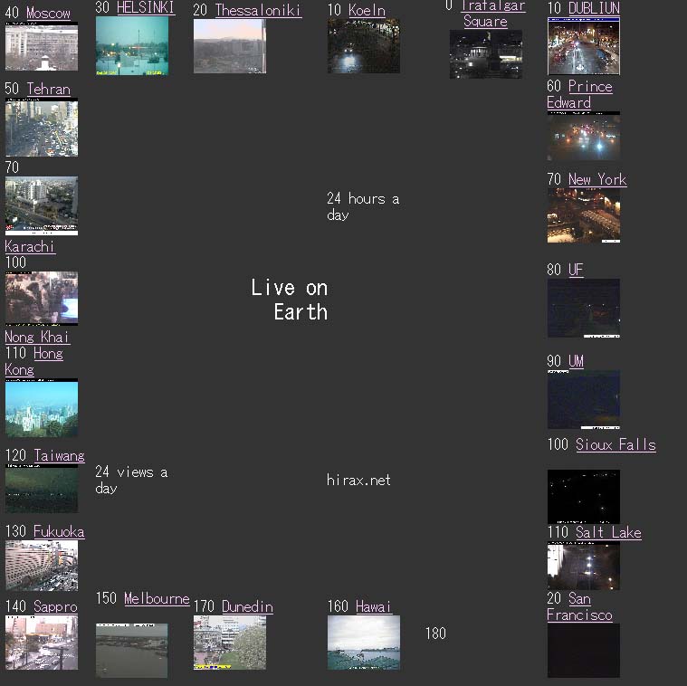 そこで、「朝のリレー」を自分の目で眺めてみたくなった私は自分用に世界各地のウェブカムを経度方向一周分のサークルに並べてみることにした。それがこの"Live