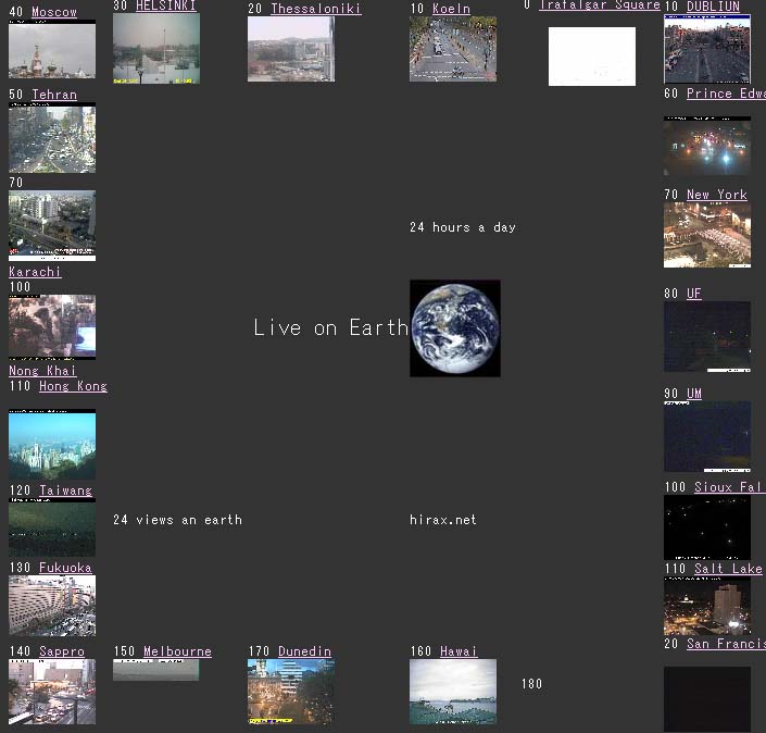 on Earth"だ。24時間で一回りする地球上のウェブカムを24(今のところ-1)個並べて、夜と昼が地球上を駆け抜けていく様子を眺めてみることにしたのである。ただ、世界中の街の景色が貼り付けてあるだけの、だけど世界の街中を遠くから近くから眺めることのできるページを作ってみることにしたのである。