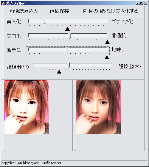 去年、「美人の微分方程式」で美人フィルタというものを作ってみた。「美人フィルタ」というのは、微分方程式を駆使することで、何故か人の顔を勝手に「美人」にしてしまうという画像処理フィルタだった。「勝手に顔を変える」とは言っても、美人の顔にされて文句を言う人は少ないわけで、美人フィルタの評判はなかなかに良かったようである。特に、日頃hirax.netなんかを見に来たりはしそうにない、女性に特に興味を持たれたようだった。hirax.net自体には何の興味持たない女性でさえも、自分の顔を美人にする「美人フィルタ」には興味を持ったわけである。