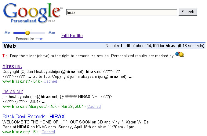 個人の趣味が反映された検索結果が得られるGoogle Personalized BETA。検索をしたら、あとはPersonalizeレベルをスライダーで変えよう。すると、リアルタイムで検索結果が変わる。