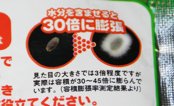 しかし、パッケージの写真を見ていると、どうしても「30倍に膨らんでいる」には見えない。首をかしげながら眺めているうちに、容積30倍というのは実は「見た目にはさほど変わらない」ということにようやく気づいた。体積で30倍ということは、長さでは3倍程度に過ぎない。つまり、「縦3倍×横3倍×高さ3倍≒体積30倍」というわけである。
