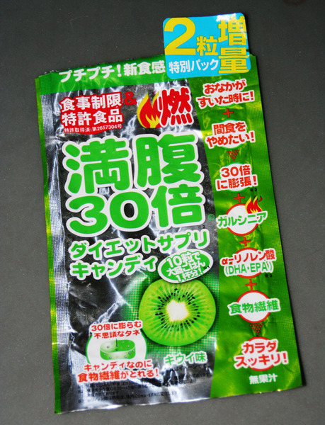 「満腹30倍ダイエットサプリキャンディ」というものを買った。キウイ味のキャンディの中に、いかにもキウイの種のような食感の粒が入っている。その「種」が水分を吸うと何と30倍にも膨らみ、充分な満腹感が得られるという。食物繊維もとれて、カラダがスッキリするサプリだという。