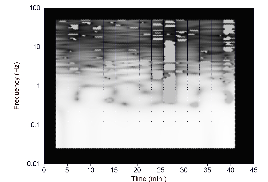 左(or 上)のチャートで、時間軸(横軸)25分過ぎに現れる高周波数を多く含む振動は小田原で停車中に「ひかり」か「のぞみ」が通過した際の振動でしょうか? 確認しやすいように、短時間フーリエ変換ウィンドーサイズを小さくしたものを右(or 下)に示してみます。
