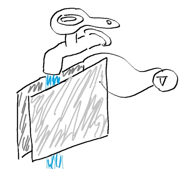 というわけで、水道の蛇口から落ちてくる水流に対して、平行電極を設置してみる、という実験を、「やってみたい」と思っているのです。さてさて、一体水流は電極の中心部では曲がるのでしょうか、それとも曲がらないのでしょうか?