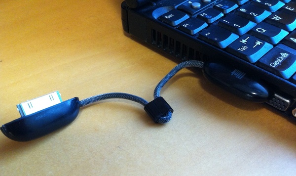 以前買った「とてもコンパクトなiPhone接続ケーブル(100円玉サイズのiPhone接続ケーブル)」がとても便利です。