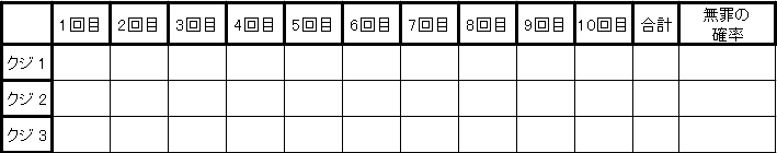 解説編の前に、まずは問題の主人公の気持ちになって、あなたなら「どんなクジの選び方」をするかを考えて決めてみましょう。「死刑」か「無罪」かのクジを、下の表で試しに10回選んでみることにしましょう。まずは、クジ1クジ2クジ3のうちのどれか一本を10回選んで印をつけてみて下さい。