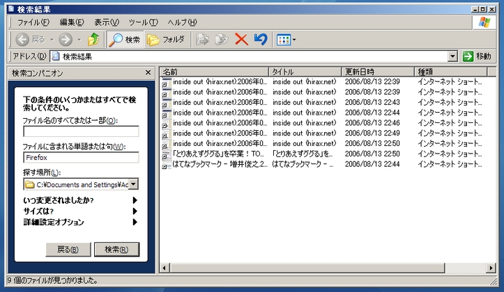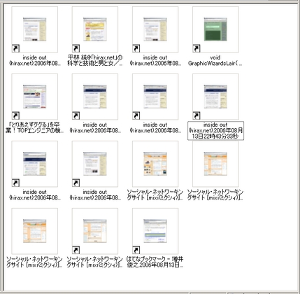 WEBページの内容はSJISで変換してありますから、後でWindowsの検索機能やらGoogle Desktopやらの適当な手段で検索をかけてやれば、眺めたページの検索が簡単にできるはず、というわけです。 また、インターネットショートカットにはサムネイル画像も付けられているので、イメージ的な検索も(現時点では)人力検索で、直感的にできるかもしれません。