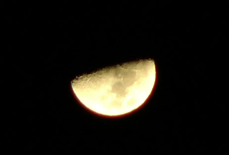 というわけで、とりあえず月を望遠で撮ってみた。車のハンドルの上でカメラを月に向けてみただけなので、少々ブレているかもしれないが、それでも月の海が見える。何だか面白い。