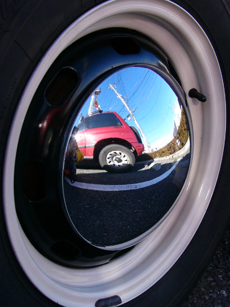 どこぞの写真とちょっと似てるかも。これは何日か前に見た、フォルクスワーゲン ビートルの車輪に映る世界。そんな世界がぎゅぅ〜っと、ねじ曲がって見えるのは、ワタシの目のせいではない、と思う。