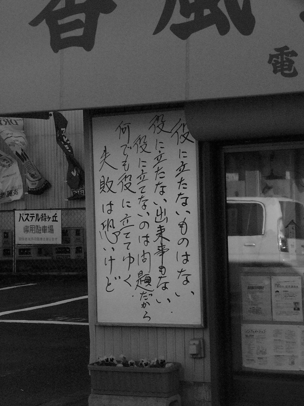 通勤途中にある不思議な店。そこにはいつも「必ずトクする今日の一言」が書いてある。どんな人が書いているんだろう。よく判らないけれど、とても活動的な人だろうとは想像できる。 これから、写真を時折撮ってみようかな、と。