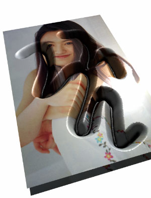ちょっと付け足してみました。まだ表面のテクスチャー属性しか付けていませんけれど、ガラスみたいなロゴとかも簡単?に作れるようになるハズ。高さ情報はアルファチャンネルを使えば、「飛び出す目の玉」や「ボリューム感のあるバスト」なんかも簡単に作ることができますよ。ね、いかがですか?