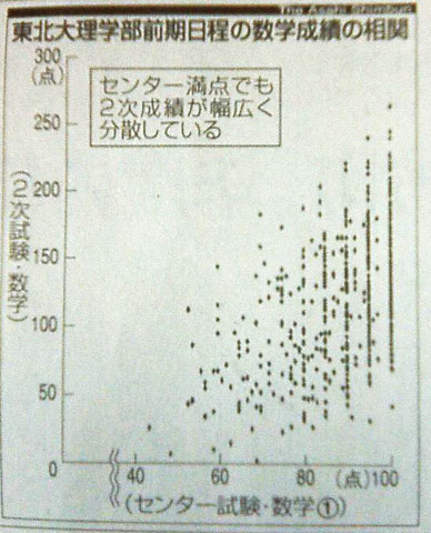 東北大学の理学部志願者の「センター試験」と「2次試験」の各教科成績を調べ、外国語などはセンター得点が高ければ2次得点も高いという相関が表れたが、数学では相関が極めて低かった、との森田康夫氏による分析結果。 基礎統計学から見た入試も一緒に眺めると面白い。