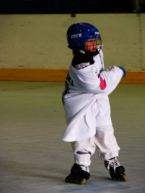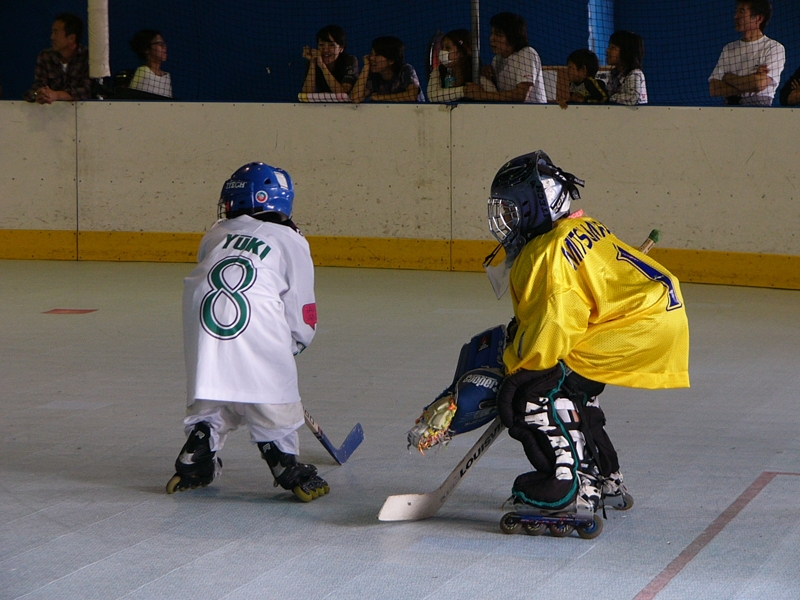 相手のゴーリー(ゴール・キーパー)もきっと邪魔だろうに(ルールから言えば押し出しても良いハズなのに)がまんしてるのかな? なんだか、とても可愛いなぁ。