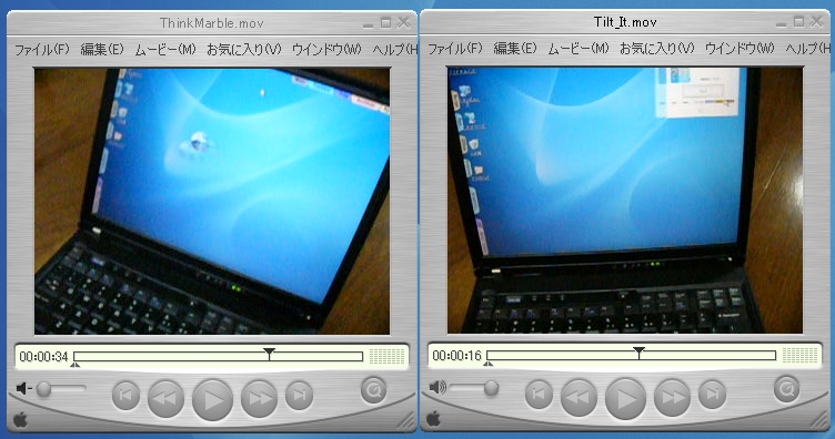 Thinkpad加速度(傾斜)センサ読み取りアプリケーション、Thinkpadを傾けてWindowを動かそう、Thinkpadで「地球転がしアプリ」と遊んでみましたが、その内容をひとまず動画にしておきます。まずは、Thinkpadを傾けてWindowを動かすアプリ(Tilt_It.mov 5.3MB)とThinkpadで「地球転がしアプリ」(ThinkMarble.mov 8.5MB)です。