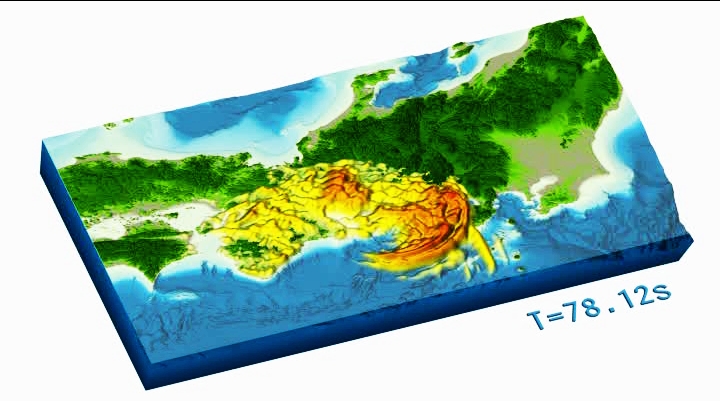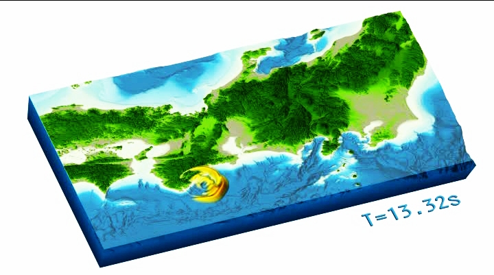 なんだかとてもブルーになりつつ、地球シミュレータで計算された東南海-東海地震の揺れの様子を眺め直すと、さらにブルーになりました…。ちなみに、沼津は伊豆半島の西(左)の付け根辺りです。これは、地震波が最も東側に偏る(私からすれば)最悪に近いケースであるようですが、やはりブルーです。