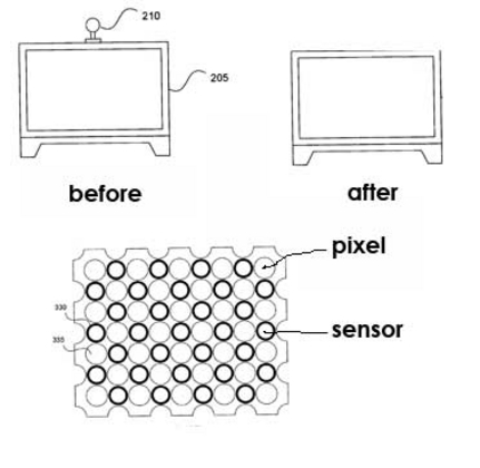 液晶ディスプレイ中に微小な無数のカメラを埋め込むことで、ディスプレイ画面とカメラを一体化させるというアップルの特許を「アップルの百眼ディスプレイ特許(Apple patent embeds thousands of cameras among LCD pixels)」から知った。United States Patent 20060007222というその特許を読んでみると、要点は「表示素子が並んでいるディスプレイ中に、撮像素子が埋め込まれていること」「撮像素子の前面のみに(表示素子の前面を遮ることがないように)レンズが装着されていること」となっている。