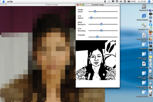 「ナンシー"小"関 風 パッチもん版画」作成ソフトを作ってみました。使い方は、顔画像を"nancyKOseki.exe"のアイコン上にドラッグ&ドロップするだけ…です(もしも、アイコンを直接ダブルクリックした場合には、添付のアインシュタイン顔画像を使います)。後は、必要に応じて適当に調整をすればOKです。キーボードの"s"ボタンを押すと、結果画像が"○×のパッチもん版画.00.jpg"というようなJpegファイルとして保存されます。また、ソフトウェアの終了はキーボードのESCを押して下さい。 細かい説明やソース添付版は、Mac OS X 版をトライした後に付け足してみます。色んな作成画像の例は「こちら」です。なお、Mac OS X (PPC)版はこちらです。