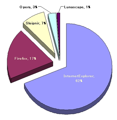 一般的にはFireFoxを使う人の割合は8.9%だというデータと比べてみると、このiside out(hirax.net)はそれでもFirefoxは多い方に見えます。それでもIEの1/4です…。この日記ページでなく、hirax.net全体で調べたりすると、もっとFirefoxの比率は減ってしまいそうです。ちなみに、画面サイズは幅で言うと240〜5120ピクセルといった分布ですね。