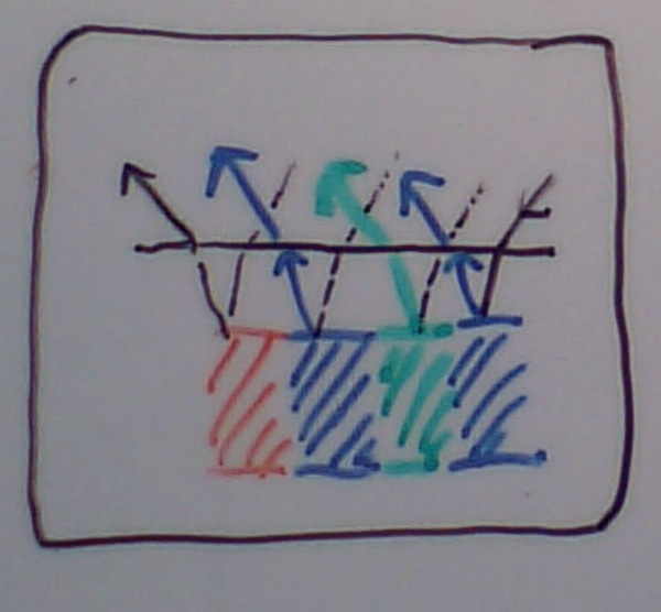 しかし、白い服が水に濡れたときには、状況が異なってくる。水の屈折率が1.3強であるため、繊維と水の間の屈折率差が小さくなり、繊維と空気の間で反射・屈折があまり生じなくなってくる。その結果、照明光が白い服をそのまま通過して、服の下に到達・反射した後に、また白い服を透けて外に出てくる…ということになる。