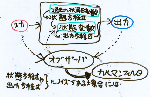 本屋で理工系の棚を眺めてみると、制御工学の書籍がたくさん出版されている。その半分くらいは「Matlabによる○×制御工学」というような感じだ。手にとってみると、数式が滝のように流れていて、難しくて話の流れを終えない。最後は結局Matlabコマンド一発で済ませるなら、数式追いかけたくないような…流し読みしたいような…と考えて、ふとわれに返りカナシイ気分になりながら、「(いかにも)微分方程式」から「カルマンフィルタ」までのラクガキを下敷きに描く。