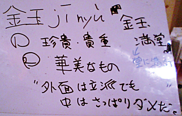 けれど、日本語の「金玉」、男性が2個ほど持つ「球状の物体」という意味は中国語の「金玉」にはない。中国語の玉はたとえば宝石のように貴重で美しいものを表現する言葉であって、「丸いもの=球」ではない。だから、中国語の金玉は金色の球でもなければ、日本語のキンタマでもない。……そんなわけで、「金玉満堂」は「財産が蔵に沢山詰まるほど豊かになりますように」という願い・祈りになる。