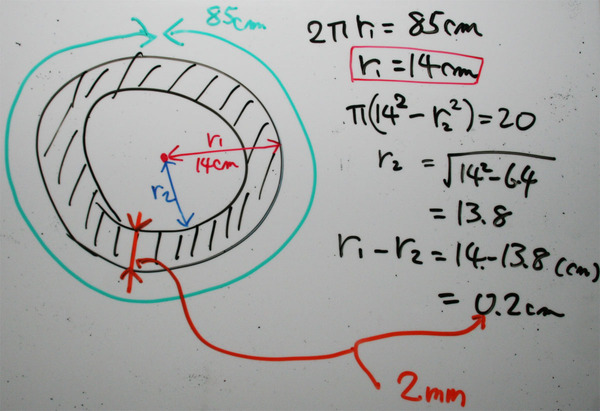 すると、たとえばウェスト(腹部周囲長)が85cmの人であれば、20cm^2ほどの「腹部断面積」の変化は、腹部の半径(脂肪厚み)が2mm減少することに相当することがわかる。ということは、「腹部全脂肪面積」=「腹巻で腹部を巻くようにしたときの円筒状の部分の表面積」とした時の昨日の計算結果、すなわち、腹部の半径(脂肪厚み)が1.6mm減少する、という結果と大して違いがないものになる。