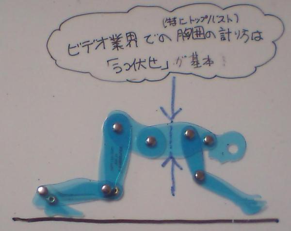 (右の図のように)「(手をついた)うつ伏せ」の状態になって計るのが普通だ……という。この話を聞いたときに考えたことは、そんな計り方をするのは、(特に計測対象が大きな人が多い業界で)「90度の角度で、お辞儀をするスタイル」は腰に悪いからではないか、という想像である。5kg近い負荷を上半身にかけ、90度のお辞儀姿勢は大変そうだから、「(手をついた)うつ伏せ」でトップバストを計るのが一般的になったのではないか、という妄想である。