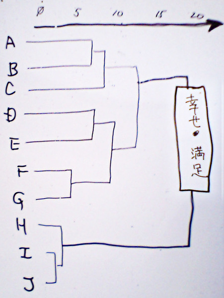 そして、amazonで表示される「お勧め本」やはてなダイアリの「お勧めページ」を算出するのと同じように、つまりはその選択肢を選んだ人の重複度合いなどを計算し、クラスタ分析をした結果の樹形図が右のようになります。右の図ではA,B,C……などのように記号で書いたありますが、もちろん、本の中でもアルファベットが書いてあるわけではなく、「お金」「睡眠」「時間」といったものがクラスタ分析・表示されているわけです。つまりは、「クイズの答え」を知りたくなったら、本書を手にとりそのページを眺めてみて下さいね、ということになります。