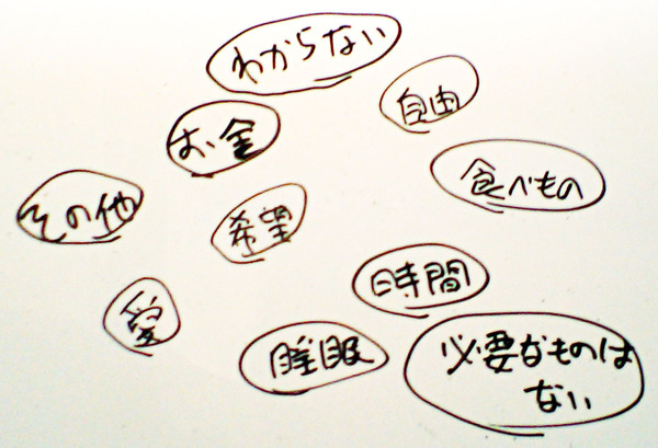 『理系サラリーマン 専門家11人に「経済学」を聞く! 』を出す際に、200人の人たちに「あなたが豊か・幸せになるために必要なものは何ですか?」と尋ねてみました。右に走り書きしたような「自由」「お金」「食べもの」「時間」といった選択肢を並べ見せながら、その人が豊か・幸せになるために必要なもの、を尋ねてみたのです。