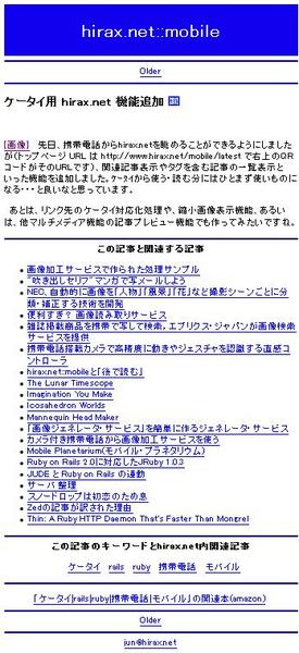 先日、携帯電話からhirax.netを眺めることができるようにしましたが(トップページ URL は http://www.hirax.net/mobile/latest で右上のQRコードがそのURLです)、関連記事表示やタグを含む記事の一覧表示といった機能を追加しました。ケータイから使う・読む分にはひとまず使いものになる・・・と良いなと思っています。