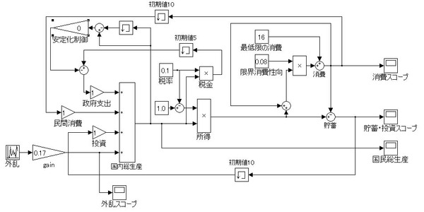 今日は、前回作ったSimulinkモデルを単純化し、乗数理論の項を読みながら、さらに「消費を国民所得と限界消費性向を使った関数に変えてみた」のです。ついでに、「(景気の)外乱」まで付け加えてみました。