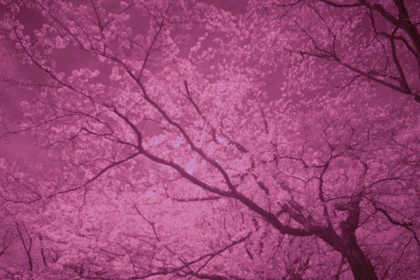 桜の花が満開で、時折、散る花びらが見える。そんな風景を違う目で見たら、たとえば赤外線で眺めてみたらどうなるだろうと思い、花散る景色を赤外線写真を撮ってみた。