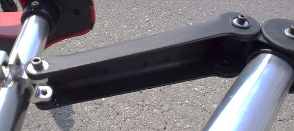 たとえば、前輪と後輪を繋ぐ角型シャフトは、純正品の方が細く、中央部分の折りたたみ部にはかなり遊びがあり、少し曲がってしまう。しかし、パッチモンの角型シャフトは純正品より一目でわかるほどに幅広く、折りたたみ部を伸ばした状態では全く遊びがなく堅いのである。それに加えて、パッチモンのシートシャフトと全部を繋ぐプラ部品には、(右の写真のように)内部にリブが形成され剛性を確保しているのに対し、純正品にはそのようなリブはなかった。つまり、単なるU字断面構造の強化プラスチックである。そこで、ためしにその部分を握ってみると、純正品ではグニッと変形するするのに対し、パッチモンの方は変形しない。材料自体の硬さは違うのかもしれないけれども、作りが違うせいか、力をかけたときの変形具合が違う。もちろん、変形が大きいのは純正品の方である。ちなみに、純正品のプラ部品内部の構成写真が下の写真だ。