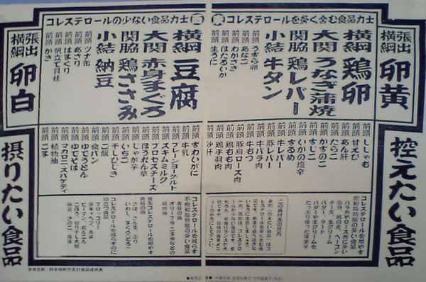 しかし、このチラシは面白い。こういう風に見せるアイデアも楽しいが、一見同じような食品なのに、コレステロールの量が全然違っていたりすることにも新鮮な驚きを感じる。その最たるものが、コレステロール番付の「張出横綱の卵黄と卵白」だ。同じ卵の中にいるものなのに、両極端で全然違う。