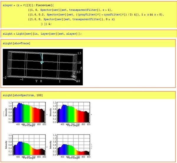 a=Light[new][setSpector, D65][spector][600]というように記述をすることができます。これは、スペクトル属性を持つ「光オブジェクト」をつくり、そのスペクトルをD65光源と同じにし、そのスペクトルの600nm波長の強度をaに代入する、という内容です。最初の例のような、括弧で多重に囲われているのではなく、括弧が連続しているので、括弧の対応や処理手順がわかりやすくなっています。