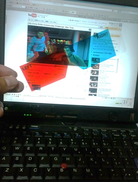 左右の目から見た動画を二つ同時にとって横に並べてからアップロードすれば、YouTube側で立体視の処理をしてくれるそうですよ。しかもアップロードするときのタグに「yt3d:enable=true」さえ入れればいいそうです。視差動画を横に並べた(左目動画は左、右目動画は右に配置した)動画をアップロードすれば、動画を観る際に、プルダウンメニューから平行法や交差法や、あるいは「赤青(シアン)メガネ立体動画=アナグリフ動画」を自由に選ぶことができるようになっている。