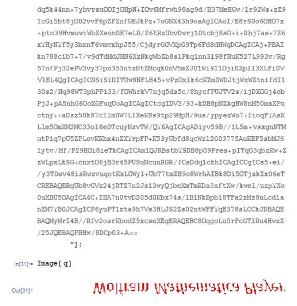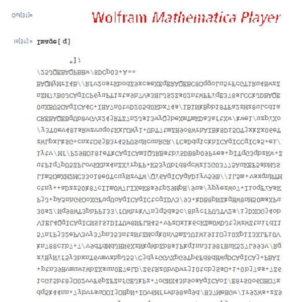 おやおや?、この画像は、何かアルファベットのように見えます。そこで、ひっくり返してみると、右のようになります。そう、「Wolfram Mathematica Player」という画像データが圧縮されて、.nbp形式のファイルには埋め込まれているのです。一見、特に何に使われるわけでもない「Wolfram Mathematica Player」という文字が埋め込まれているのです。
