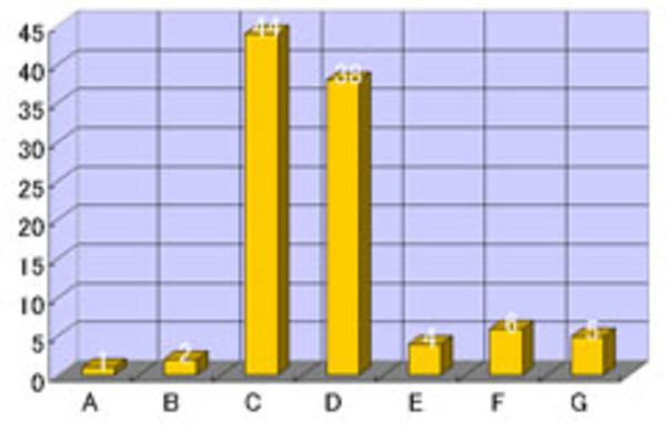 私は伊藤理佐の「おいピータン!!」というマンガが好きなので、「Kiss」というマンガ雑誌を読んでいます。Kissはおそらく20~30歳くらいの女性を読者ターゲットとしている雑誌ですから、30代後半男性の私としては、少し読み辛く感じたりもする雑誌です(高校~大学院時代は「花とゆめ」を読んでいました…)。最近、このKISSの末尾広告ページにアップルC・Dという、バストにかぶせバストを二回りくらい大きくする「バスト増大化パーツ」の広告が掲載されています。そして、宣伝の中に「彼女にするなら何カップ?」「2005年6月に渋谷で20~30代の男性に聞いてみました」という街角アンケートの結果が掲載されているのです。そのアンケート結果が、右上のグラフです。横軸は「カップ」で、縦軸が(そのカップを支持した)「人数」です。宣伝中には、このグラフを使って「断然CカップDカップが支持されている」と書かれていました。