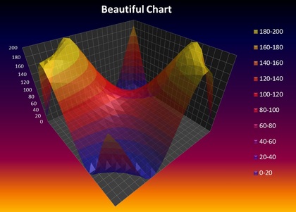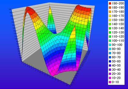 このアプリケーションを使うと、開かれているエクセルの中のチャート(複数のチャートがあれば、一番最初に作成したもの)を、等高面グラフや濃度グラフを、スペクトルカラー風にしてみたり、炎風の色表現にしてみたり、青→赤の色表現にしてみたり、と色々なことができます。…あるいは、Bitmapファイルを適当に作ってやれば、左端がグラフ中の下端の色として扱われ、一番右端の色が上端の色として使われたグラフに変えることができます。つまり、自由自在にチャートの色を簡単にカスタマイズすることができます。しかも、縦軸の最大・最小・分割幅なども設定することができるようになっています。