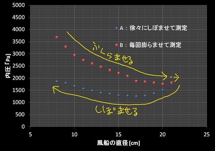 この結果を眺めると、(少なくともある程度の直径の範囲では)風船を膨らますにしたがって風船の内圧は下がるが、途中から若干の増加がみられ、また、そこから風船をしぼませていくにしたがって内圧は一時的に下がるが、風船径の減少にしたがって、内圧は増加するという結果がわかります。風船のゴムが弾性限界を超え、降伏点を超えているような挙動が見えてきます。