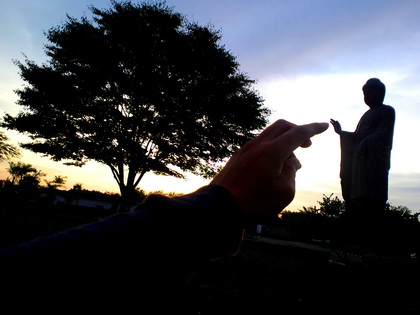 その大仏を見ながら、「距離」が離れているから「大きさ」がわからないからこそ面白いこともあるかもしれない…と寝ぼけ頭で思いました。そういうわけで、こんな写真を撮ってみました。「とても小さな大仏さまの掌に、指先で触れてみた」という写真です。薄暮の空の中に佇(たたず)む”小さな”大仏さまに、人差し指で触れてみたのです。