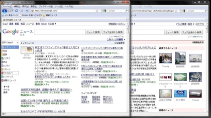 そこで、ためしに、同じ2つのサイトを(それぞれ独立のウィンドウで)ブラウザーで開き・眺めてみました。それが、下の画像です。上の画像がThinkPad Edge 13”の画面をキャプチャしたもので、下の画像がThinkpad X61Tabletの画面例です。横幅はほとんど同じですが、縦長さが結構違います。この画面の縦長さ・広さの違いを気にするか・気にしないかは、人それぞれの「ノートPCを使って何をするか」や「本人の志向」によるかもしれませんね。