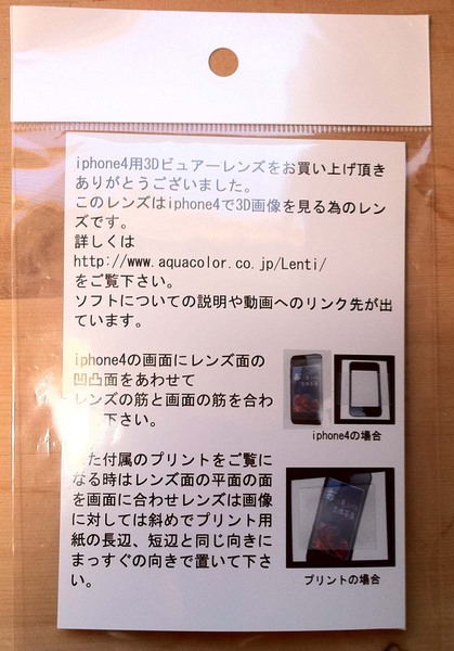 「iPhone4を3D化するキット」を見かけ、とても楽しそうだったので思わずってしまいました。「iPhone用3Dビュアーレンズ」と題したそのセットは、(iPhoneのサイズを十分カバーする大きさの)レンチキュラーレンズと(そのレンチキュラーレンズを使って)立体表示を行うための画像変換を行うソフトウェア一式の紹介文章が付属している、というキットです。販売しているブースを眺めたとき、何だか心から楽しそうな雰囲気が感じられて、思わず買ってしまったのです。