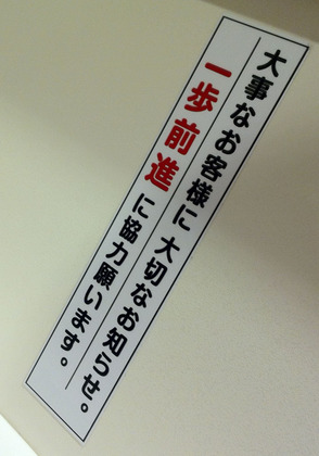 右の写真は、男子トイレの便器の上で見かけることが多い「公共広告」です。明治大学ラグビーの北島元監督が叫び続けたモットー「前へ」というキャッチフレーズを思い起こさせる、「もう一歩前へ」というポスターは、男子便所でかなりの割合で小便器の上に貼られていることが多いものです。