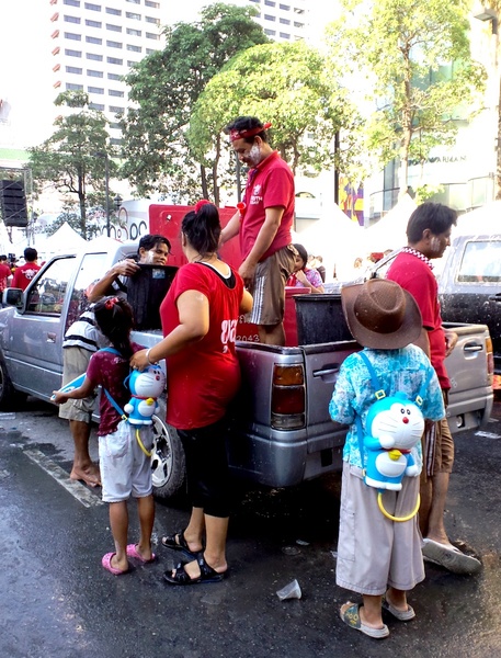 一年前、占拠状態の街にいるドラえもんを不思議な心地で眺めていました。たくさんの赤と若干の黒シャツを着た人たちが溢れる占拠地の中心集会所地区で、重要個所を守る警備員も(占拠地帯で占拠を続ける親戚たちと共に遊ぶ)こどもたちも、どちらも同じようにドラえもん銃を持ち、同じように気まぐれに水鉄砲をこっちに向けて、水をピューっと掛けてきたりします。