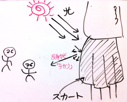 制服のは粗い繊維でできています。そんな制服に光があてられたとき80パーセント程度の光は繊維内部に入り・そして繊維の中で吸収され、やがて熱エネルギーに変わります。残りの20パーセント程度の光は、スカートの繊維表面で反射し四方八方に散っていきます。四方八方に散る…ということは、どこかひとつの方向に反射するわけではありません。つまり、スカートがテカって見えるということはないわけです。