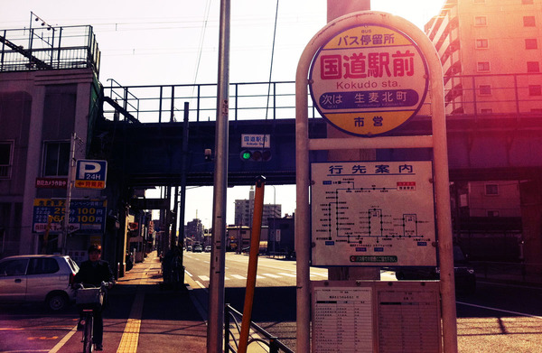 「高周波前」という理系心をくすぐる、けれど奇妙奇天烈な名前のバス停を目にしてから、変な名を持つ色々なバス停を眺めたくなりました。そんなわけで、先日眺めに行ったバス停は「国道駅前」という名を持つバス停です。もう少し正確に書けば、「市営バス停・国道駅前」という名前で、一体「市」なのか「国」なのか、バスなの(普通の)車両なのか列車なのか、道なのか駅なのか…その辺りを実に煙に巻く不思議な名前を持つバス停なのです。
