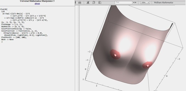 タイムリーなことに「おっぱい(曲面)方程式を作り出した」という世紀の大発見がありました。そこで、まずはハロー・オッパイということで、Mathematica版「おっぱい(曲面)方程式」を書き、「Wolfram CDF PlayerをMathematicaとして使う方法」をRubyでもっと簡単にしてみたのやり方を使い、Universal Mathematica Manipulator 3でおっぱい(曲面)方程式を描いてみました。描いた結果が右上画像です。