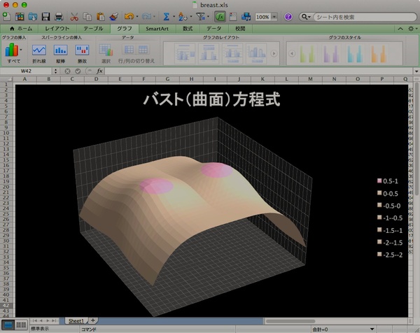 今日は、世紀の大発見「バスト(曲面)方程式」をExcelで描いてみようと思います。昨日は、Mathematicaでカラフルにカスタマイズしたバージョンを描いてみましたが、Mathematicaではやはり敷居が高いのではないでしょうか。Mathematicaをすでに持っている・インストールしている人であればともかく、そうでない人は「CDF PlayerをMathematicaっぽく使うために、まずはCDF Player をダウンロードする」という作業をしなければならないことも多いだろう、と思います。…それは少し面倒です。そこで、「いいおっぱいの日=11月08日を前にした今日、"xls"フォーマットの「バスト(曲面)方程式」シートを作ってみました。